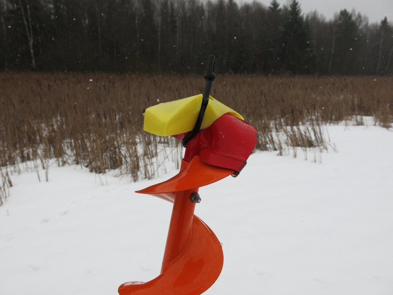 Надо отметить яркую позитивную расцветку как чехла и режущей головки, так и самого бура – он теплого оранжевого цвета. За счет этого виден издалека даже в туман. Засверленный в конце ряда свежих лунок, он служит хорошим ориентиром для направления движения во время облавливания, когда сами лунки могут теряться.