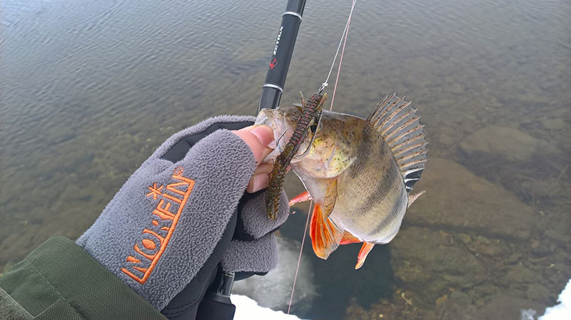 Я, на самом деле, в разгар летнего сезона достаточно ярый противник оснастки «отводной поводок» – а зачем? Тот же окунь прекрасно ловится на другие приманки, любой поверхностный воблер всегда добавит зрелищности. Но «тяжелый» зимний спиннинг – это действительно совершенно другой случай, и как раз тут данная оснастка выступает настоящим лидером в качестве подачи пассивного силикона для неактивного хищника. И в этом случае Hogy Shrimp стал действительно «палочкой-выручалочкой», так как стал сразу показывать результат.