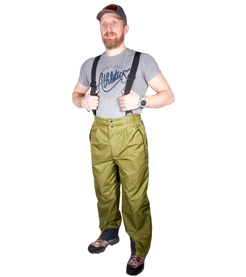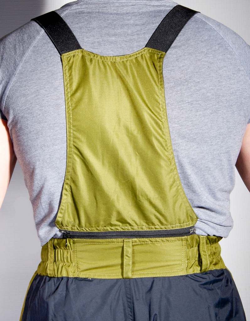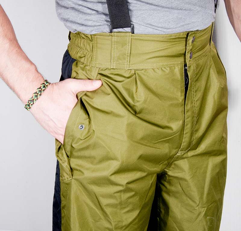 Для комфорта в использовании, а так же для защиты области поясницы от ветра, брюки выполнены в форме полукомбинезона, с регулируемыми эластичными лямками. При необходимости лямки можно отстегнуть. Так же предусмотрено использование поясного ремня.
