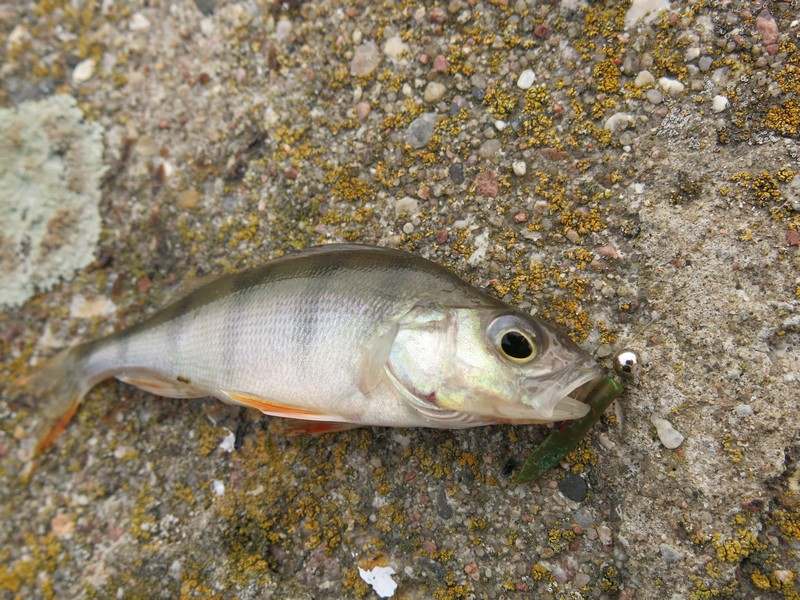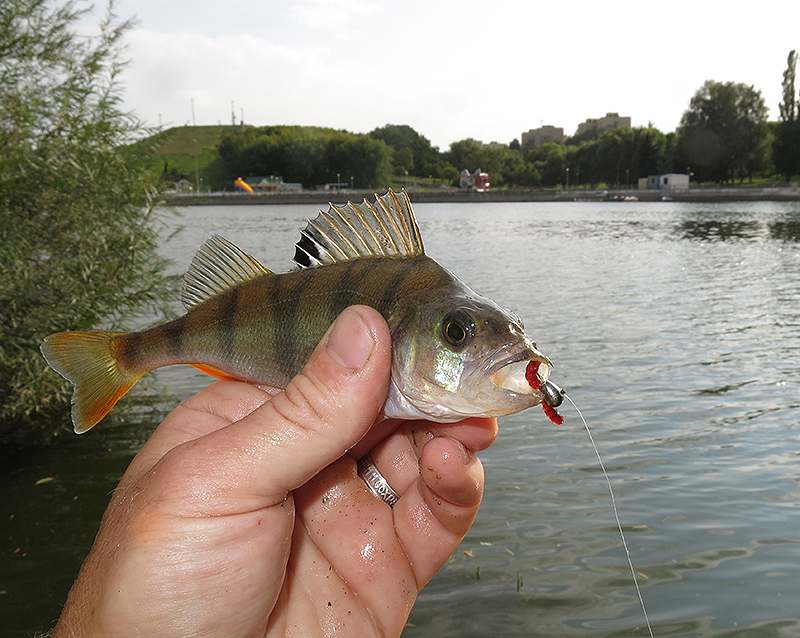 Разную рыбу я ловил по-разному. Начал с окуня – он клевал на обычной классической спиннинговой проводке. После заброса приманки опускал ее на дно, а затем вел постоянными подергиваниями – наподобие как зимой, только со льда мормышка играет горизонтально, здесь же – вертикально. Пробовал вести волочением по дну – результат был заметно хуже. Но и слишком высоко идущая приманка тоже давала меньше поклевок. Стало понятно, что для окуня нужно делать проводку у дна, но не опуская на него. Чтобы мормышка не подымалась слишком высоко, можно делать незначительные паузы, то есть вести приманку пелагически – волнообразно в толще воды.
