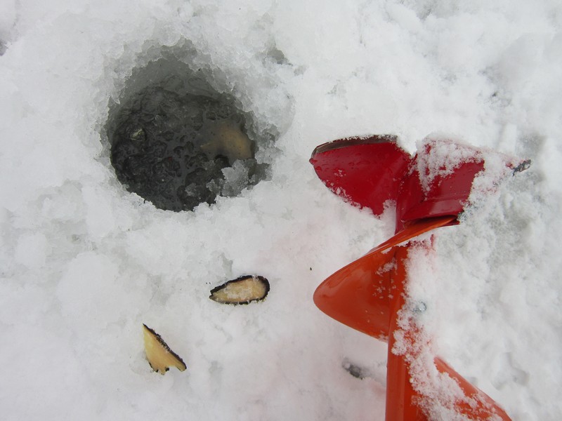 Сами лунки тоже должны делаться с умом. Учитывая, что ловля в основном ведется в прибрежной акватории на небольшой глубине, шугу и снег лучше не вычищать, проделывая лишь небольшое отверстие ручкой черпака или стеблем камыша для пропуска приманки. Когда клюют одни окуни, ледобур рациональнее заменить пешней вне зависимости от толщины льда. Стук окуни любят, а малые отверстия во льду поспособствуют маскировке.