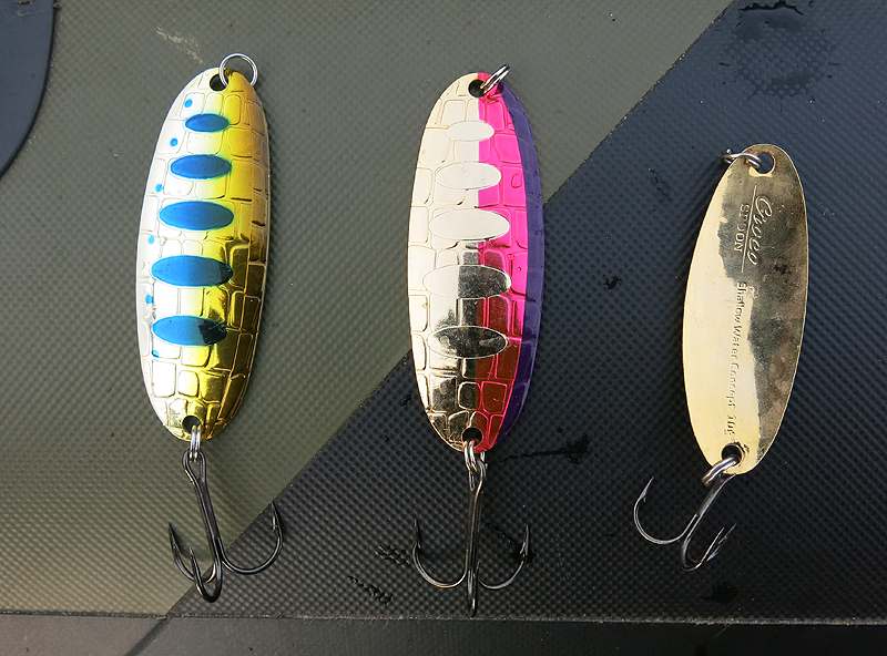 Отдельно в мелководной спиннинговой коробке выделяются колеблющиеся блесны. Их не так много, но некоторые годятся для быстрой проводки на небольшой глубине. Например, это модель Lucky John Croco Spoon, версия для мелководья – Shallow Water Concept. Вес таких колебалок – 10 и 15 г, но за счет широкой формы и объемного тонкого тела они поддерживают нужный горизонт проводки.
