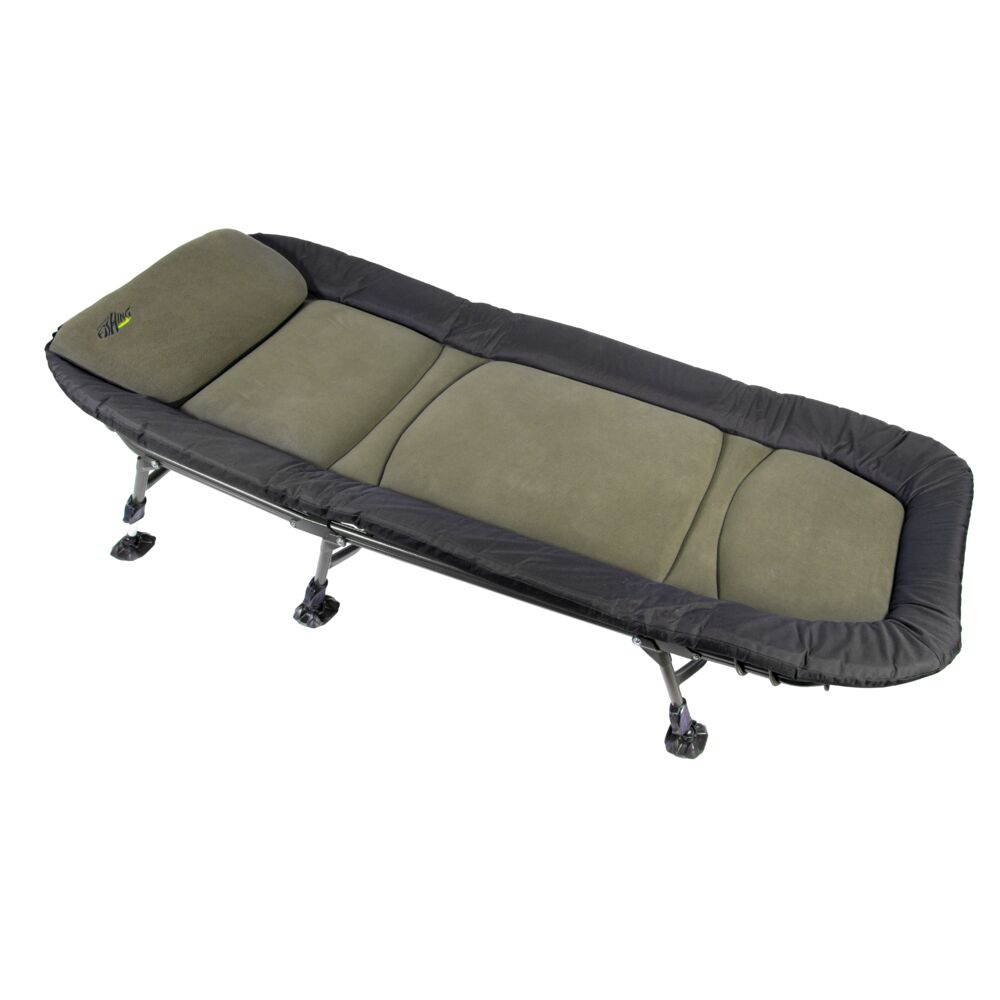 Благодаря мощной алюминиевой раме и высокому качеству изготовления с легкостью выдерживает вес до 140 кг, обеспечивая при этом максимальное удобство для рыболова. Мягкая набивка и приятное на ощупь флисовое покрытие центральной части прекрасно отводят влагу в жару и сохраняют тепло в холодное время года. Края матраса отделаны износостойким полиэстером. Уникальная система фиксации матраса к раме предохраняет его от провисания, а интегрированный мягкий подголовник-подушка гарантирует максимальный уровень комфорта.