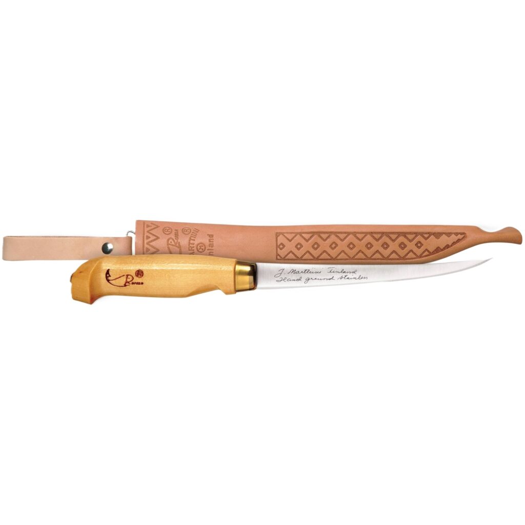Равномерно сужающийся клинок из скандинавской нержавеющей стали со сверхострым лезвием и хвостовиком во всю длину рукояти для легкого филетирования.