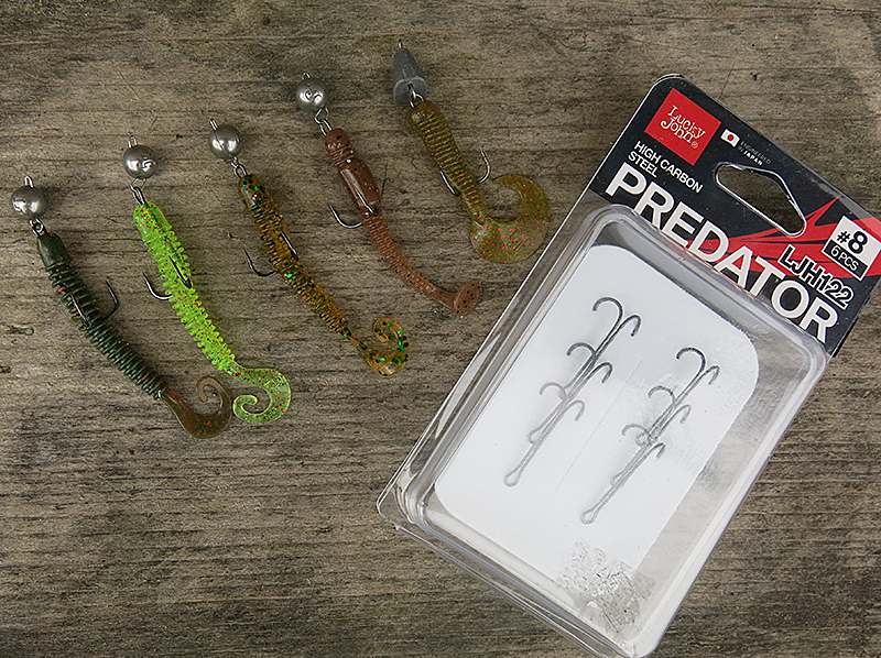 Когда ловлю классическим джигом на чистом дне, а поклевки вялые, то иногда оснащаю Ballist и двойником. Из-за тонкого тела такой крючок выбираю из самой тонкой проволоки, иначе при оснащении он просто порвет тело приманки. В последнее время для подобных приманок использую двойники LJH122 – с длинным цевьем. Пробовал и одинарный крючок, но на нем приманка часто сползает и крутится. Хотя при ловле в чистых водоемах для разнесенных оснасток такой вариант будет предпочтителен – оснащенный на двойнике «Баллист» может крутиться. Но это касается именно разнесенок, с грузом-чебурашкой таких проблем нет.
