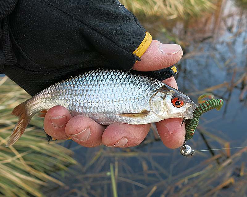 Лишь до самого ярких – например, белого и розового, очередь пока не дошла. Хотя, когда задумал заняться ловлей прудовой форели, то цвет F05 Super Pink себе взял. А так же точно знаю, что он сработает по ротану.