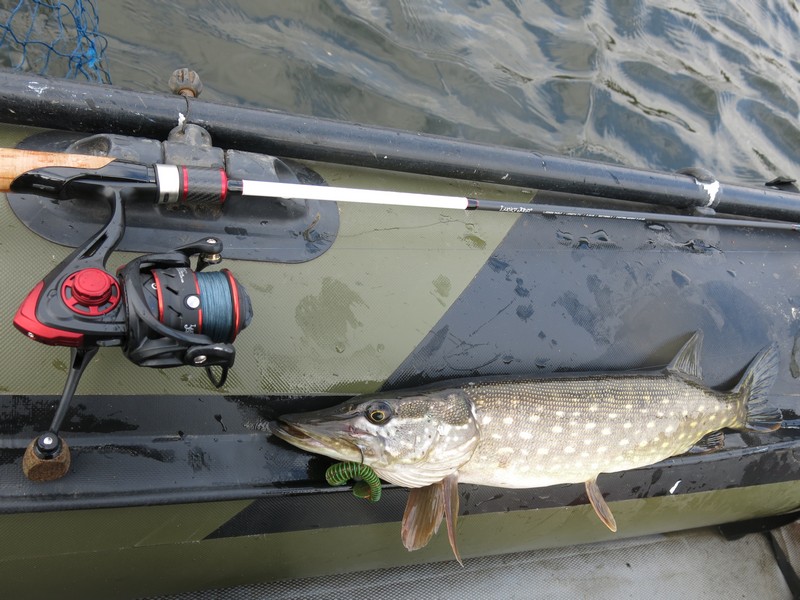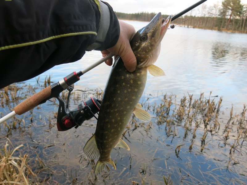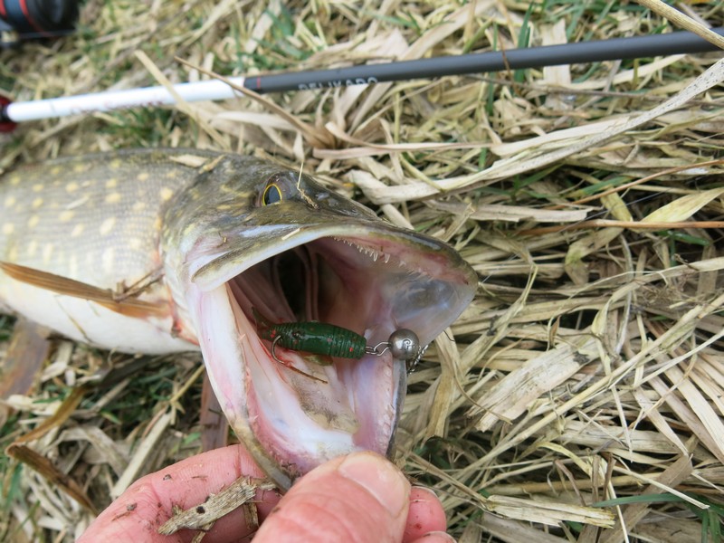 Основным объектом ловли стала щука. И если с лодки Delikado был, скорее, дополнительным инструментом, то в береговом джиге стал основным. Изначально велся поиск окуня, но полосатого хищника быстро заменила зубастая. И для нее потребовались более крупные приманки и их дальний заброс. С такой съедобной резиной как Spark Tail 3 и J.I.B Tail 2 на чебурашках 6-7 г ловить получалось комфортнее всего.