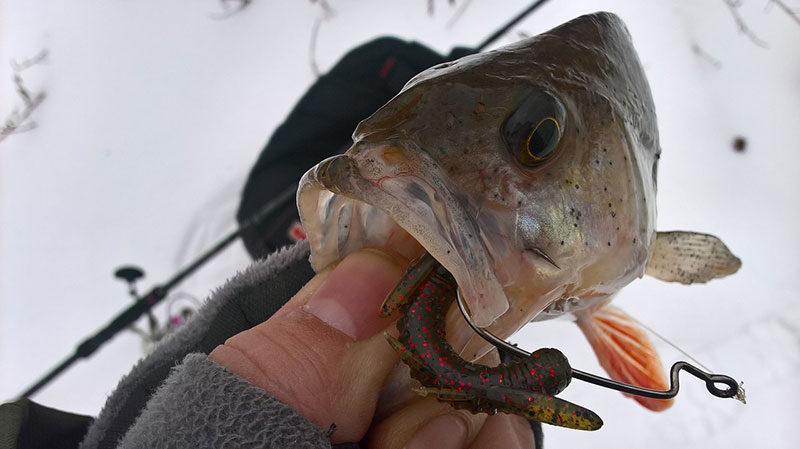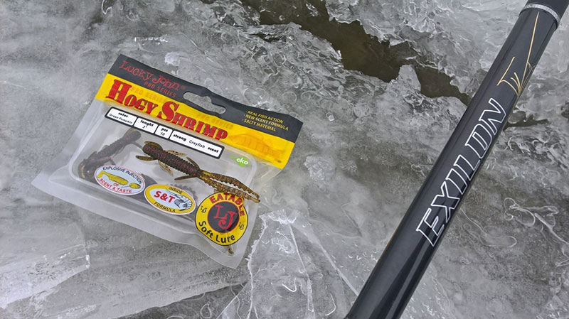 Я, на самом деле, в разгар летнего сезона достаточно ярый противник оснастки «отводной поводок» – а зачем? Тот же окунь прекрасно ловится на другие приманки, любой поверхностный воблер всегда добавит зрелищности. Но «тяжелый» зимний спиннинг – это действительно совершенно другой случай, и как раз тут данная оснастка выступает настоящим лидером в качестве подачи пассивного силикона для неактивного хищника. И в этом случае Hogy Shrimp стал действительно «палочкой-выручалочкой», так как стал сразу показывать результат.