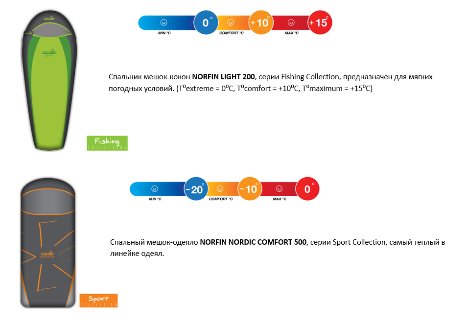 Спальные мешки NORFIN имеют маркировку, указывающую верхний и нижний пределы комфортной температуры, а также экстремальную температуру, при которой спальник теряет свои тепловые свойства.