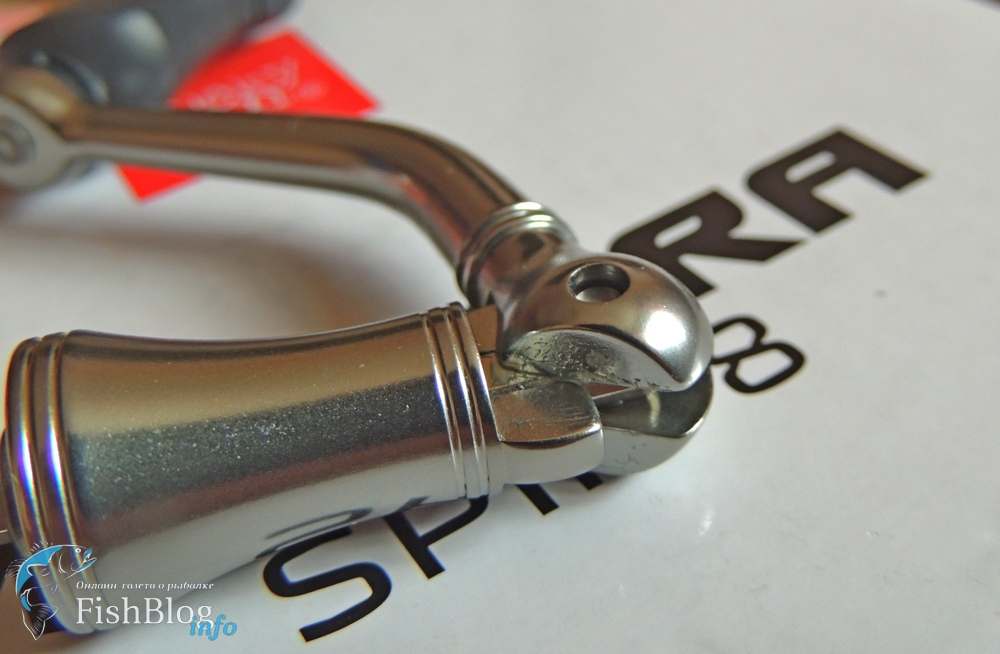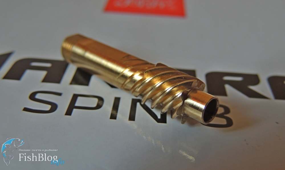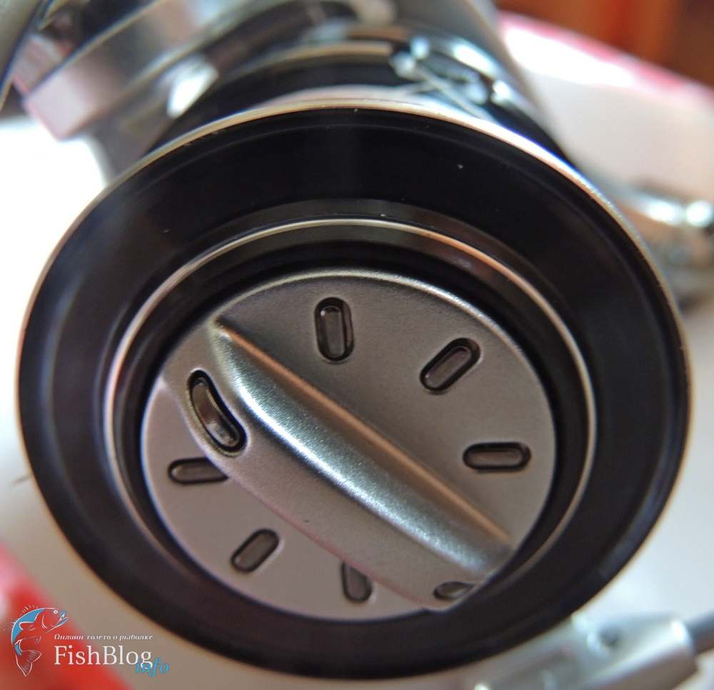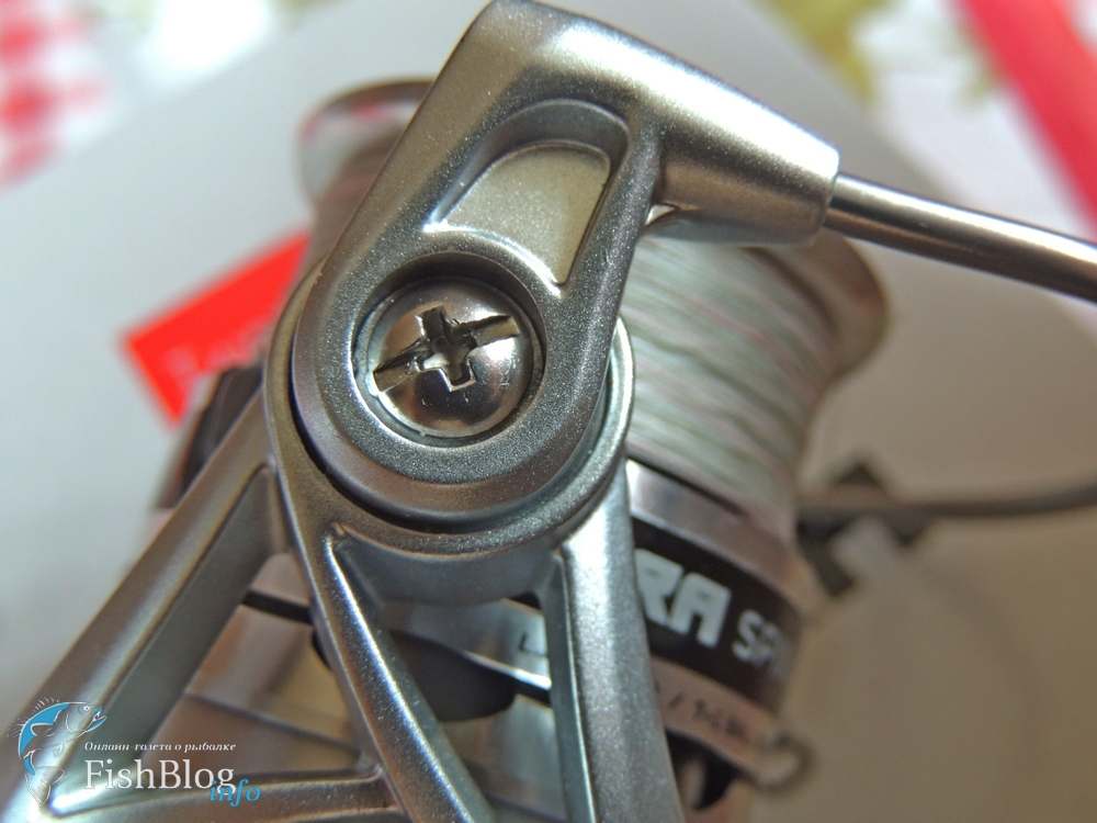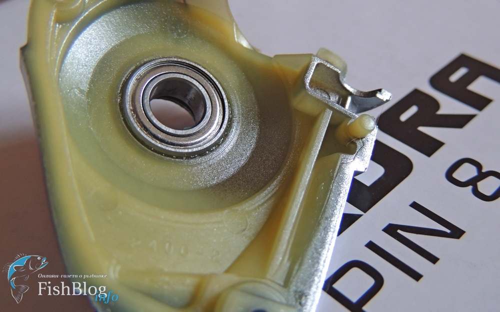 Шпуля изготовлена из алюминия и весит 50 грамм. По ее периферии расположились отверстия, служащие в большей степени для декорации, нежели для ее облегчения. Заусенцев и нештатных следов от режущего инструмента замечено не было, вполне годная токарка. Торцы шпули, непосредственно контактирующие с другими элементами в сборке, обработаны с большей точностью, в отверстие установлен шарикоподшипник. Борт шпули имеет скругленный профиль, который, по идее, должен меньше препятствовать сбрасываемому шнуру при забросе. Как это будет на практике – покажет сезон, а пока продолжаем копать вглубь. Фрикционная гайка надежной конструкции с большим количеством положений способствует плавной настройке фрикциона. Плечи ротора, как и весь корпус, – это композит, по паспорту – карбонопласт, в жизни – весьма сомнительно из-за несоответствия цвета материала карбону.