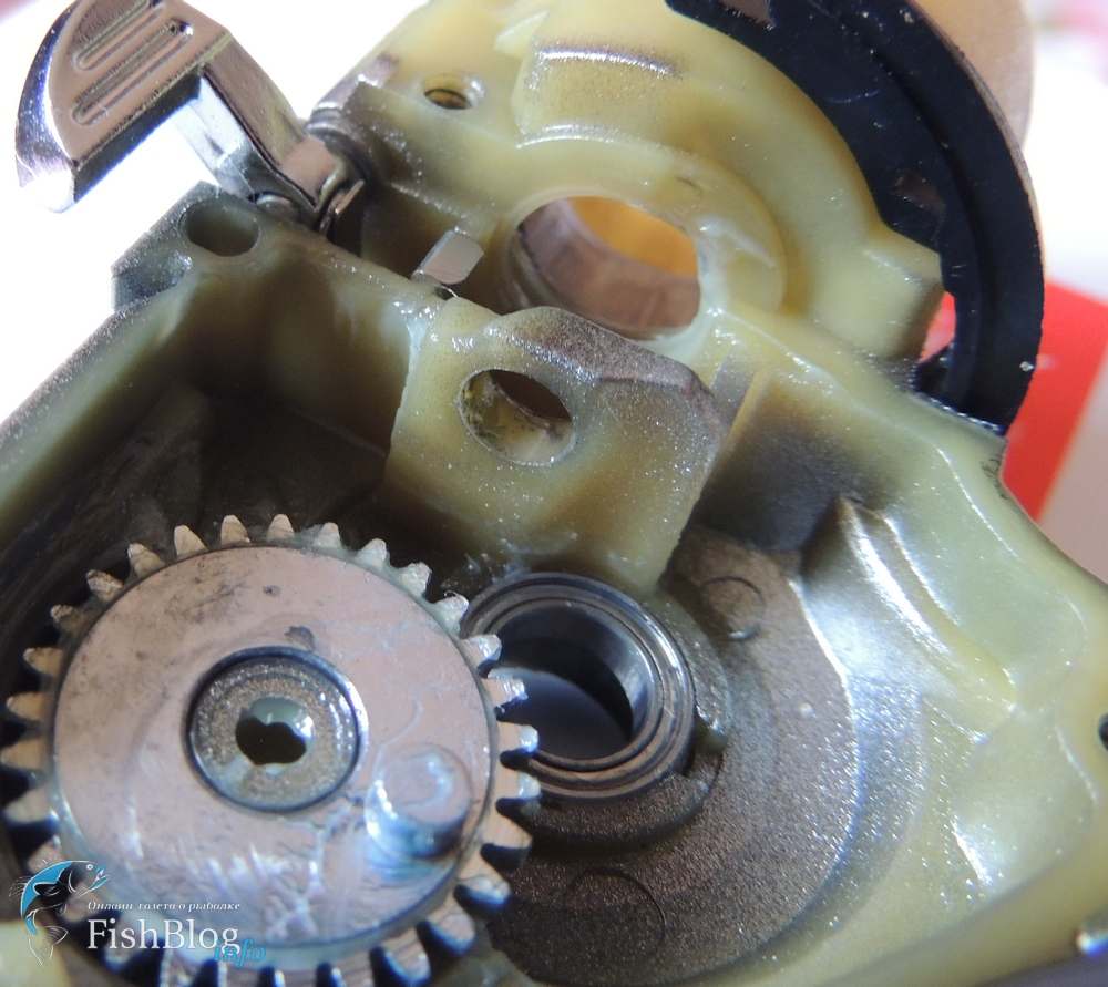 С учетом некоторых весьма узнаваемых узлов и решений, можно с уверенностью сказать, что в общем и целом мы видим перед собой рестайлинговую версию Ryobi Ecusima с некоторыми улучшениями: дополнительные подшипники в нужных местах, несколько меньший вес, более «правильная» ручка. Ecusima давно зарекомендовала себя как недорогая, но надежная катушка. Судя по качеству сборки, можно предположить, что фирма-заказчик (Lucky John) ввела на заводе-производителе дополнительный контроль качества при сборке сегодняшнего пациента. С учетом расхожих в последнее время нареканий на качество «Риоби», это здорово, как здорово и то, что подшипники, в том числе и жизненно важный для спиннинга правый опорник ведущей, установлены сразу.