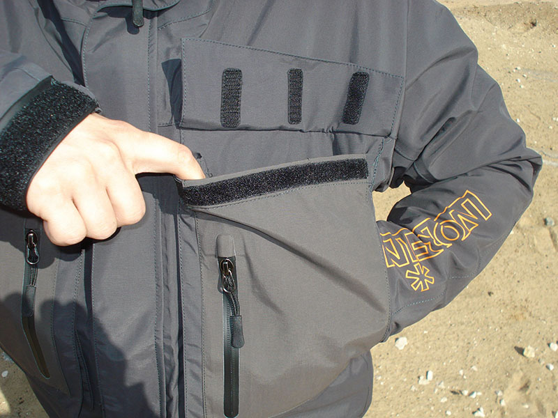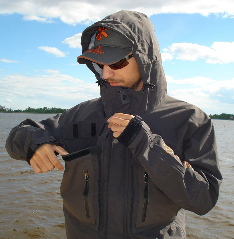 На манжетах рукавов имеются утяжки на «липучках», позволяющие плотно их затянуть. Куртка имеет достаточно просторный, анатомический крой, позволяющий свободно ее надевать поверх утепляющего слоя одежды. Во время рыбалки никакие элементы куртки не сковывают движений рыболова, как при забросах удилища, так и при активном его перемещении.