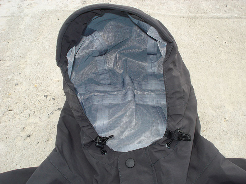 Капюшон регулируется по объему с помощью задней утяжки, а спереди имеется регулировка по овалу лица. Козырек капюшона имеет встроенный металлический каркас, которому можно свободно придавать необходимую форму, например, подогнать по обводу под козырек кепки. При этом он сохраняет заданную форму и не возвращается в исходное положение как пластик.