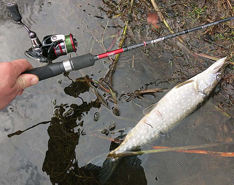 Вываживание хоть немного затягивалось, но новый спиннинг справлялся с хищницами без проблем. Щука клевала жадно – и с засекаемостью на офсетном крючке проблем тоже не было. Тогда ловля велась с берега, но позже с лодки тоже довелось испытать «Аниру» по немелкой хищнице.