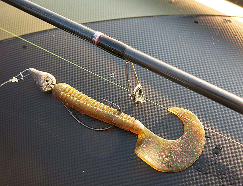 Если ловить джигом по каким-то причинам не получается – небольшая глубина, сильный боковой ветер,– можно использовать Chunk Tail и в разнесенных оснастках. Но оснастив приманку, понаблюдайте у берега за ее игрой – чтобы твистер не крутился во время проводки. Так часто происходит с подобными приманки, оснащенными офсетным крючком во время ловли на отводной поводок. В этом случае нужно подобрать другой крючок, например, легкий одинарник.