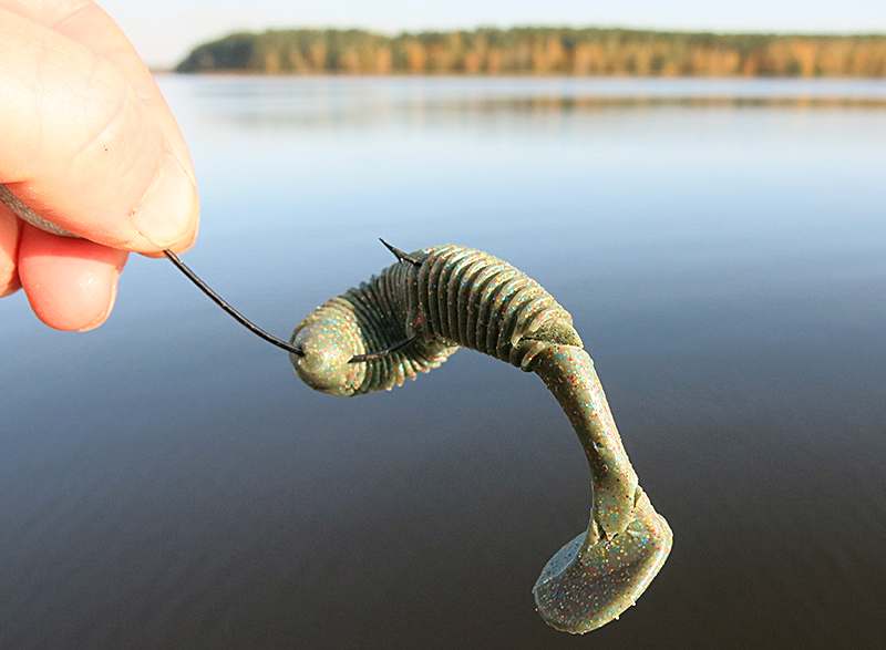 И сейчас в коробке бывает сложно определить, на какой виброхвост я уже ловил, а какой еще новый и положен в ячейку как запасной. Лишь при пристальном осмотре видны следы щучьих зубов. То же самое можно сказать об оснащении «Джоко Шэйкера». Делаю я это разными способами. Основные – это джиг-головка и двойник. При оснастке двойным крючком приманка надрывается незначительно. Да и на джиге голова виброхвоста практически не разбивается, а также не сползает по крючку.