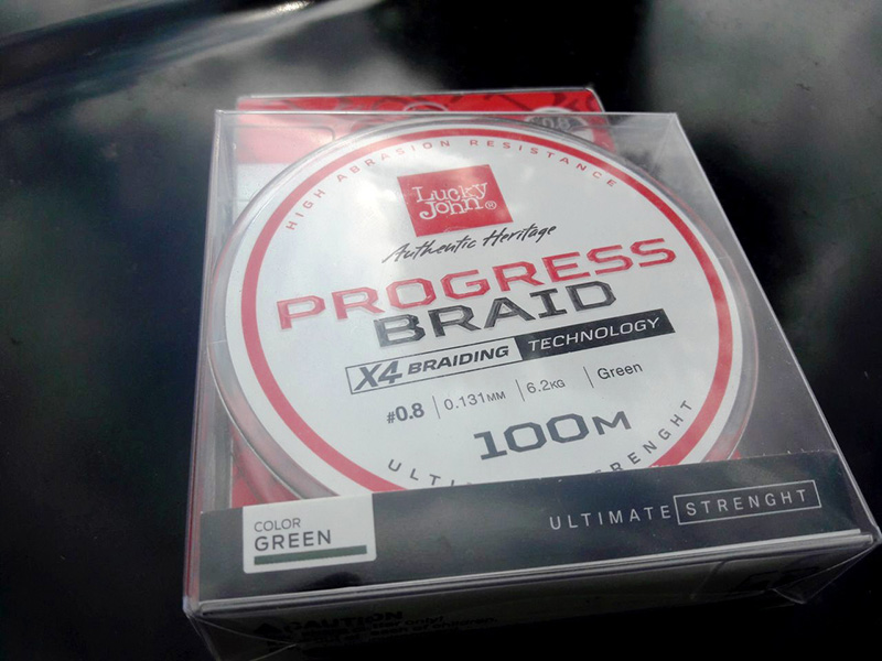 Итак, знакомимся, плетенка Progress от компании Lucky Jonh. Стандартная пластиковая упаковка, в ней шпуля, на шпуле наклейка с основными характеристиками лески. Размотка по 100м, хотелось бы побольше, так как ловля предполагалась в жестких условиях. Но тут уж ничего не поделаешь. Производитель заявляет Progress Braid как бюджетный (народный) шнур, а стоимость плетенки зависит и от метража в заводской катушке.