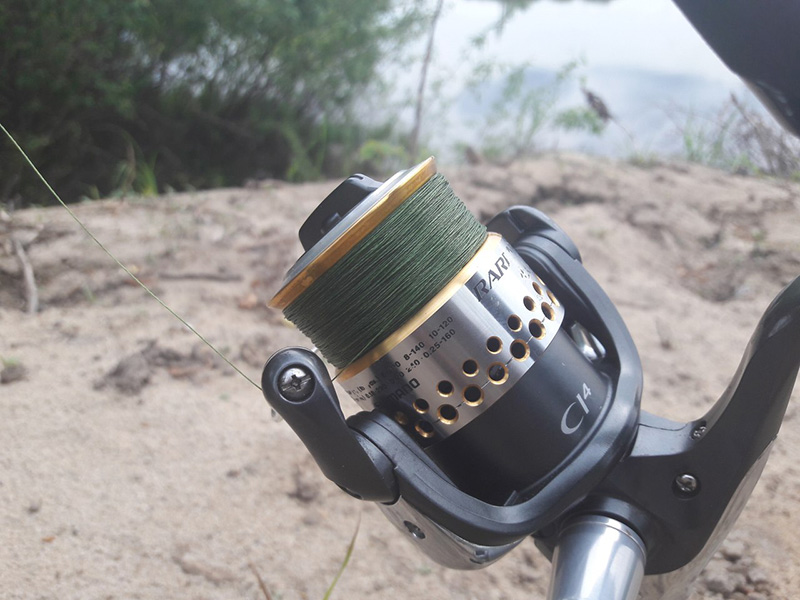 Быстренько наматываю «шнурок» на катушку размером 2500 по классификации Shimano, предварительно подмотав бекинг. Попутно попробовал шнур на ощупь. Размер #0.8 по РЕ слегка завышен, но не критично. Порадовало качество плетения — плетение плотное, «нитка» на ощупь гладкая. Цвет «хаки» будет немного затруднять визуальный контроль, но не критично.