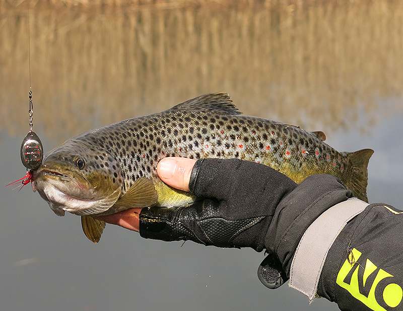 На форелевых реках хорошо клюет пеструшка, причем предпочитая средние размеры лепестка. На платных прудах ловил радужную форель.