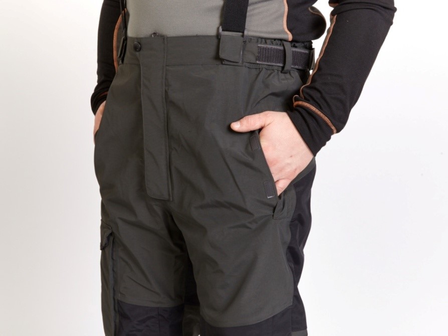 Передняя застежка-молния YKK закрывается клапаном на застежках Velcro («липучках») и сверху фиксируется кнопочным соединением. Два боковых кармана с клапанами, на текстильных застежках, сохранят их содержимое от потери и не дадут влаге попасть внутрь. На правой брючине, в области колен, имеется вместительный накладной карман, он также имеет клапан на липучке.