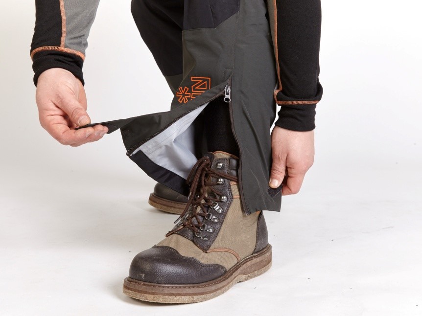 Снизу штанин имеются застежки-молнии YKK с клапанами и регулировкой объема на «липучке», что позволяет удобно носить штаны поверх ботинок или сапог. Такой крой штанов позволяет раздеться, не снимая обуви.