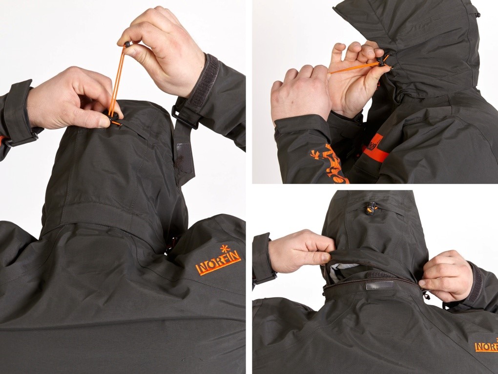 Передние части капюшона крепятся к воротнику куртки в специальных кармашках при помощи кнопочных соединений и застежек Velcro («липучек»). Такое крепление делает соединение капюшона с курткой очень практичным, капюшон не выглядит как отдельное звено.