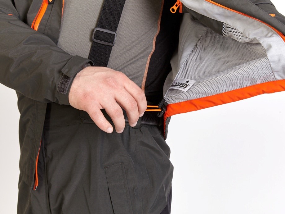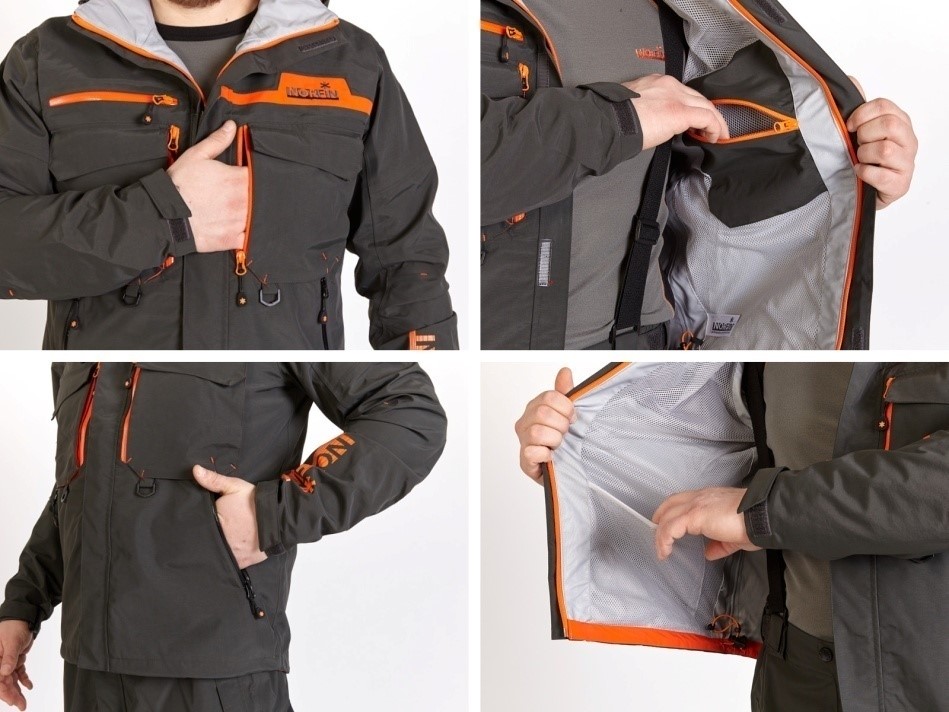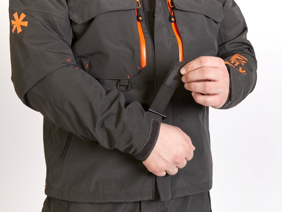 Снаружи куртки, спереди – пять карманов, снабженных брызгозащищенными замками-молниями: два на талии, два спереди на груди и один в правой части куртки сверху. Два накладных вместительных кармана на груди с клапанами, защищающими их содержимое от попадания внутрь влаги. Они надежно закрываются застежками Velcro («липучками»). Под накладными карманами имеются два пластиковых кольца для крепления рыболовных аксессуаров.