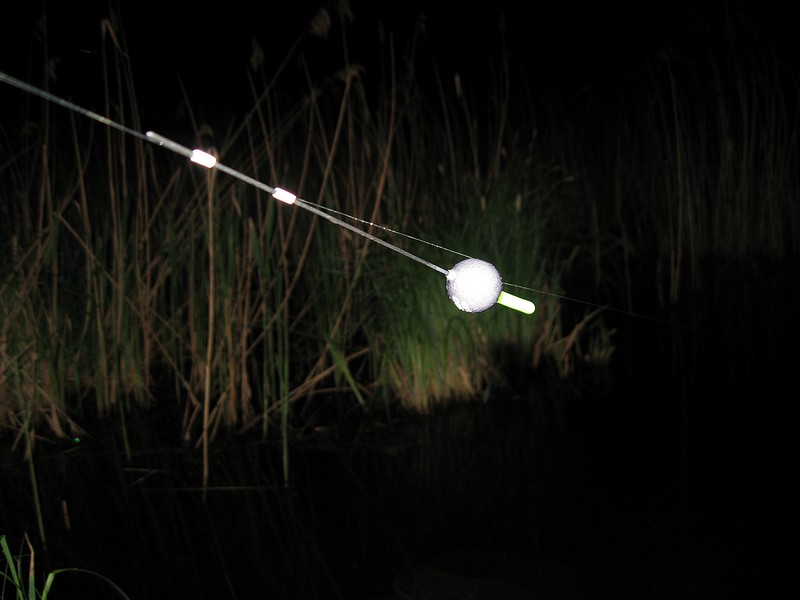 Некоторые решают проблему посредством установки перед вершинкой специально изготовленного белого экрана на контрасте с которым отклонения вершинки при поклевке видны лучше. Но даже в этом случае требуется подсветка, поэтому мне нравится собственный вариант выхода из положения. Слева или справа от фидерной вершинки на расстоянии в один-два десятка сантиметров от нее устанавливаю аккумуляторный фонарь. Причем под таким углом, чтобы излучаемый им луч света был направлен вверх, а не на воду. Креплю фонарь на телескопической подставке под удочку при помощи обычной изоленты. Видимость даже робкой поклевки при таком варианте – идеальная, а, учитывая дальность заброса, такой дополнительный источник рассеянного освещения не оказывает негативного влияния на поведение рыб. Зарядки хорошего аккумуляторного фонаря хватает даже не на одну, а на несколько ночей. Поступающий аналогичным образом мой приятель, вместо фонаря использует аккумуляторную батарею, с идущим от нее проводом и светильником.