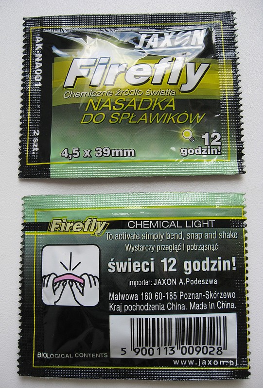 Основным, причем незаменимым элементом освещения поплавка является так называемый «светлячок» (light stick). Он представляет собой пластиковую капсулу с флуоресцентным красителем и оксалатом (сложный эфир щавелевой кислоты), при надломе которой лопается расположенная внутри стеклянная колбочка с перекисью водорода. При смешивании двух субстанций происходит химическая реакция с эффектом светового излучения.