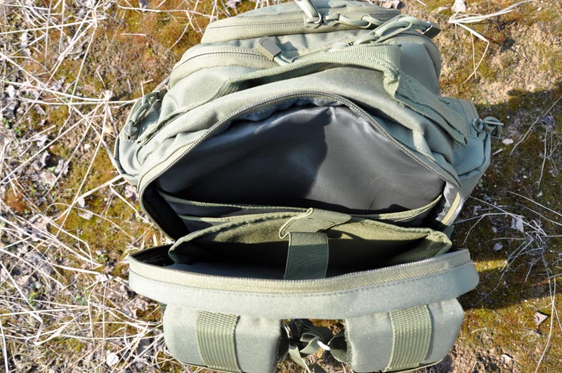 Основной объем рюкзака весьма вместительный – открывается на половину высоты для удобного извлечения вещей. Внутри имеет стропы для разделения укладки и карман из сетчатого материала с застежкой-молнией. Для меня это оптимальный объем для всех вещей, которые обычно я ношу с собой на выезды до трех суток: охота, рыбалка или суточные страйкбольные игры. Спальные принадлежности: модульная спальная система или сочетание спальника, пенки и легкой палатки – размещаются на внешнем подвесе, который здесь предусмотрен.