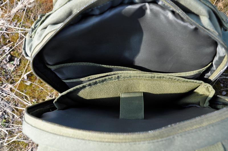 Основной объем рюкзака весьма вместительный – открывается на половину высоты для удобного извлечения вещей. Внутри имеет стропы для разделения укладки и карман из сетчатого материала с застежкой-молнией. Для меня это оптимальный объем для всех вещей, которые обычно я ношу с собой на выезды до трех суток: охота, рыбалка или суточные страйкбольные игры. Спальные принадлежности: модульная спальная система или сочетание спальника, пенки и легкой палатки – размещаются на внешнем подвесе, который здесь предусмотрен.