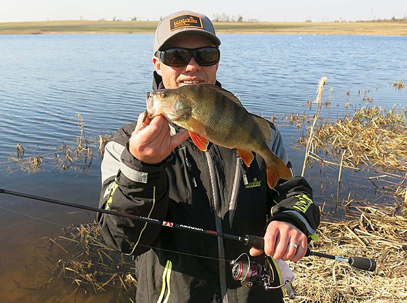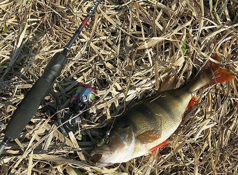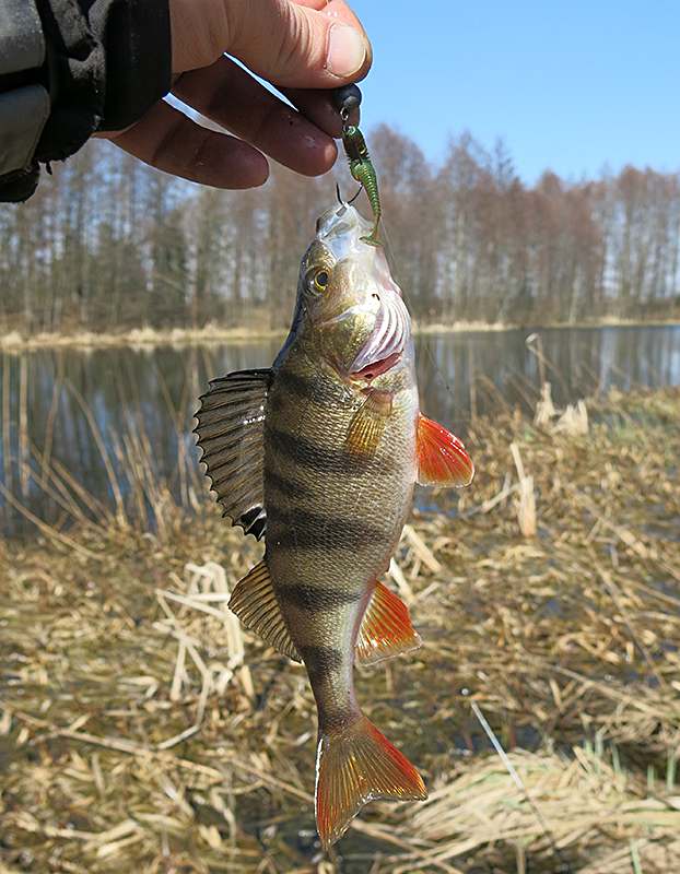 Так, например, в начале апреля на небольшой речной старице я уговаривал на поклевки окуня. После холостых атак на ступенчатой проводке перешел на обычную равномерку.