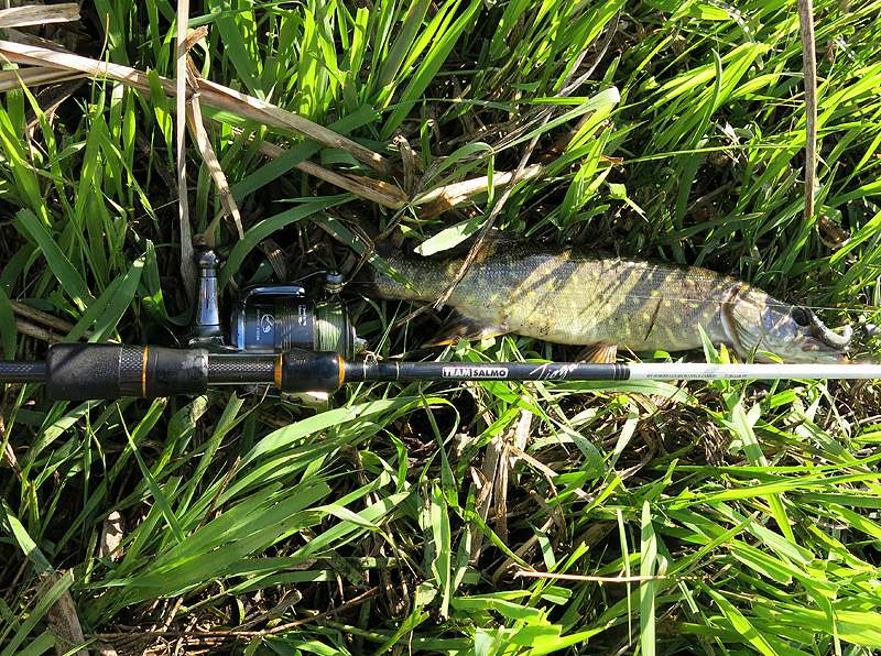 Весенняя береговая ловля продолжилась на небольших речках. Здесь особенно пригодилась универсальность удилища, ведь ловить приходилось на разные типы приманок, а спиннинг запасной с собой носить не будешь.По щуке и окуню срабатывала смена приманки, например, с вертушки на воблер, исправно ловилась хищница на джиг. Груз использовал 8-12 г, плюс приманка до 4-х дюймов. Перегруза при этом не было, еще даже оставался запас прочности. Джиговая оснастка была в основном на офсетном крючке – и просекалась активная щука неплохо.