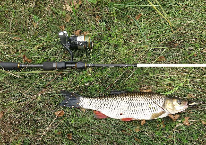 Голавлевая рыбалка. Хорошо подошел спиннинг под ловлю на такой специфический и узкоспециальный воблер, как Salmo Lil’Bug. Вот здесь и пригодилась универсальная длина 2,25 м, казавшаяся мне, как любителю коротких спиннингов, поначалу излишней. Удилище при такой ловле приходится подымать вверх, чтобы приманка шла по поверхности воды, и, по сути, чем длиннее, тем лучше, без фанатизма, конечно. Ну и с другими голавлевыми воблерами «Тиога» подружилась.