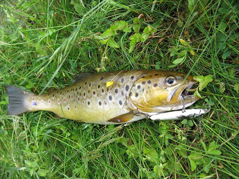 В Польше я впервые познакомилсяс форелевой ловлей на воблеры во время совместной рыбалки с директором польского Salmo Петром Пискорким. Сначала на небольшой речке мы ловили ручьевую форель твичингом и другой сложной проводкой на тонущие модели, и спиннинг справился с новой для себя задачей. Кроме того, благодаря своему быстрому строю позволял выполнять выстреливающие забросы под ветви деревьев. Хорошо он отработал с воблерами Salmo Minnow S 5 и 6 см весом 3 и 6 г соответственно.