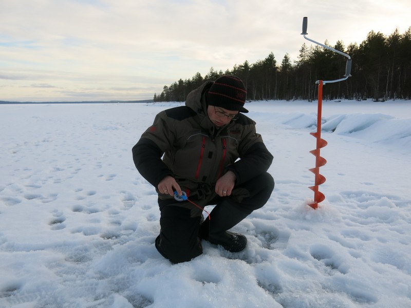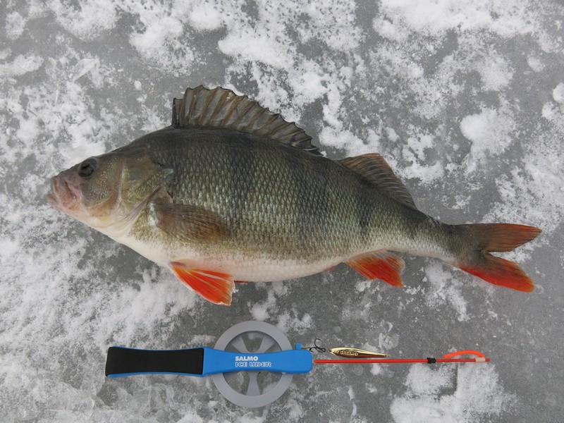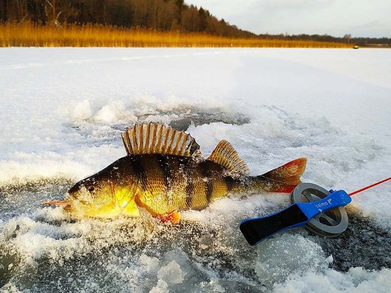 Если рыба засекается плохо, то во время ловли и подсечки прижимаю катушку пальцами. Затем отпускаю и уже начинаю вываживание, отбрасывая удочку в сторону. Из недостатков удочек Salmo Fin можно назвать открытую катушку, которая может забиваться снегом. Периодически приходится ее прочищать. На чистом льду, естественно, такой проблемы не возникает.