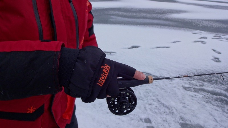 Оставляя достаточно места для хвата рукой ручки удильника, даже в перчатке.