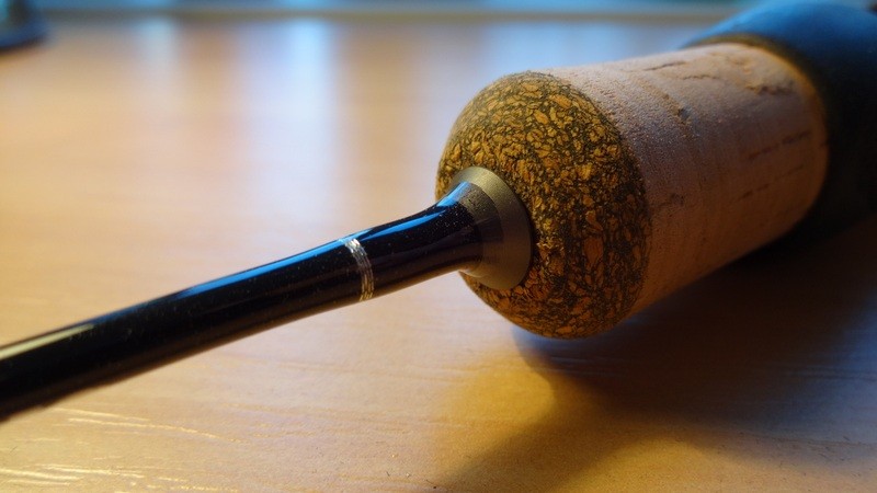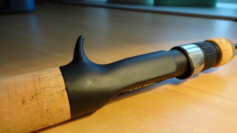 Рукоятка выполнена из пробки и имеет триггер под указательный палец. Так же, как и у классических спиннингов для ловли с мультипликаторной катушкой.