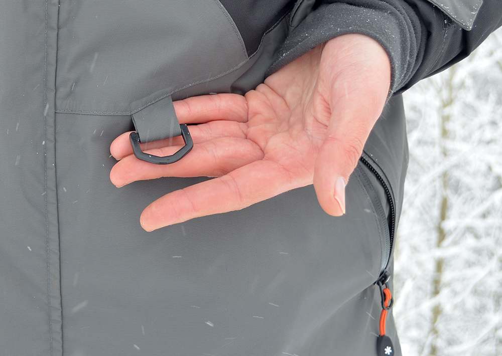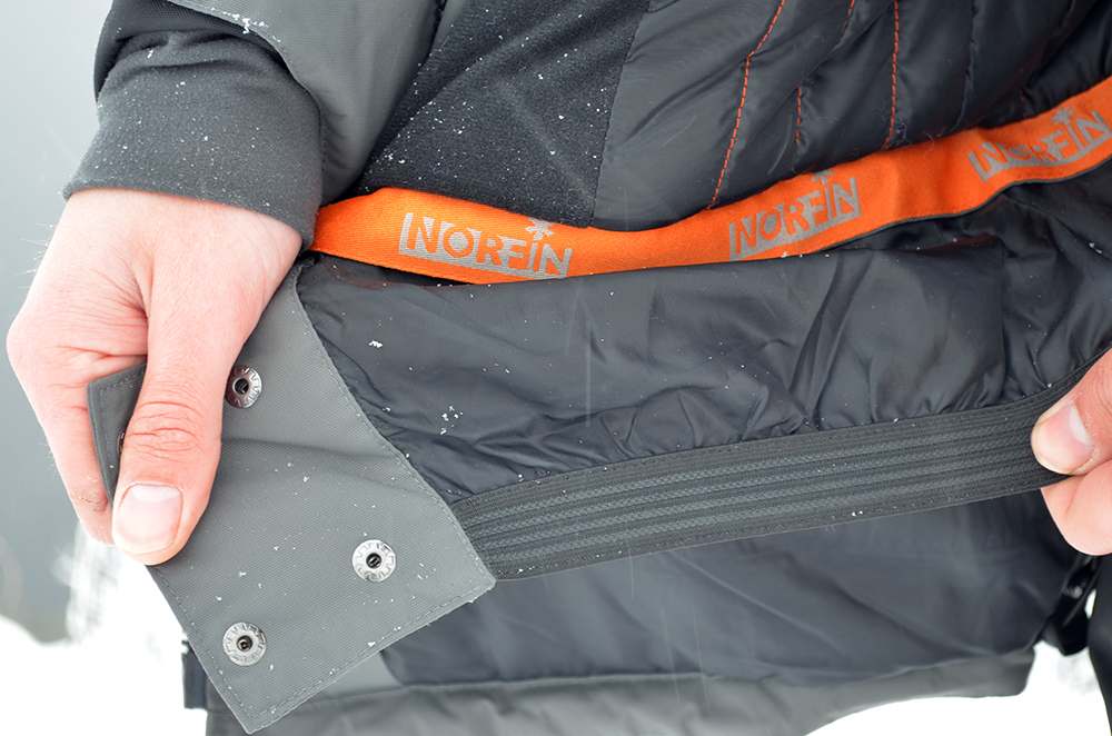 Внутри куртка имеет юбку для дополнительной защиты от ветра. В состоянии покоя она плотно прилегает к куртке и не болтается. В случае неактуальности ее можно запросто снять. Но я не снимаю, потому как случайно нашел в этой юбке одну маленькую организационную приятность – лента с резиновыми полосками. Так вот, эти резиновые полоски очень здорово цепляются за одежду и не дают куртке закатываться вверх. У меня такое сплошь и рядом: ни пройду и километра с рюкзаком, как куртка задрана до плеч. Куртку костюма Apex отдельно проверял по этому пункту с юбкой и без – резиновая система работает. Опять же, в зимнем спиннинге никто не отменял последствия бобровой деятельности, куда провалиться в снежный период в разы проще. Поэтому на всякий случай с глубоким снегом лучше обернуться юбкой. Движений она не стеснит, и в случае падения не нужно будет выгребать снег из подмышек.