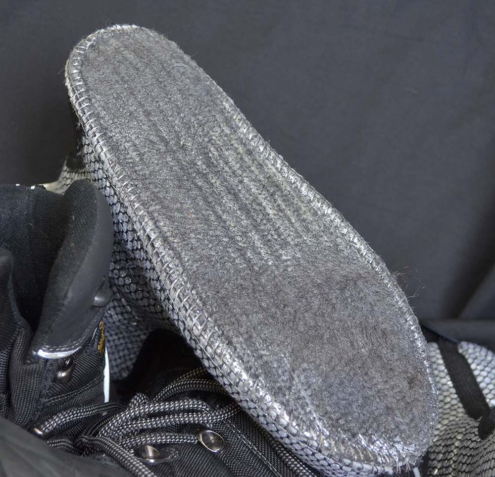 Внешний слой покрыт перфорированной фольгой, который в свою очередь покрыт нейлоновой сеткой, продлевающей жизнь фольге. Предоставленное фото подошвы вкладыша – это результат плотных забегов по самым разным местам. Как видно, износ не особенно проявился, и подошва мало чем отличается от новой. Кроме того, пятка дополнительно усилена нейлоновой вставкой с указанием размера и буквы принадлежности к левому или правому ботинку.