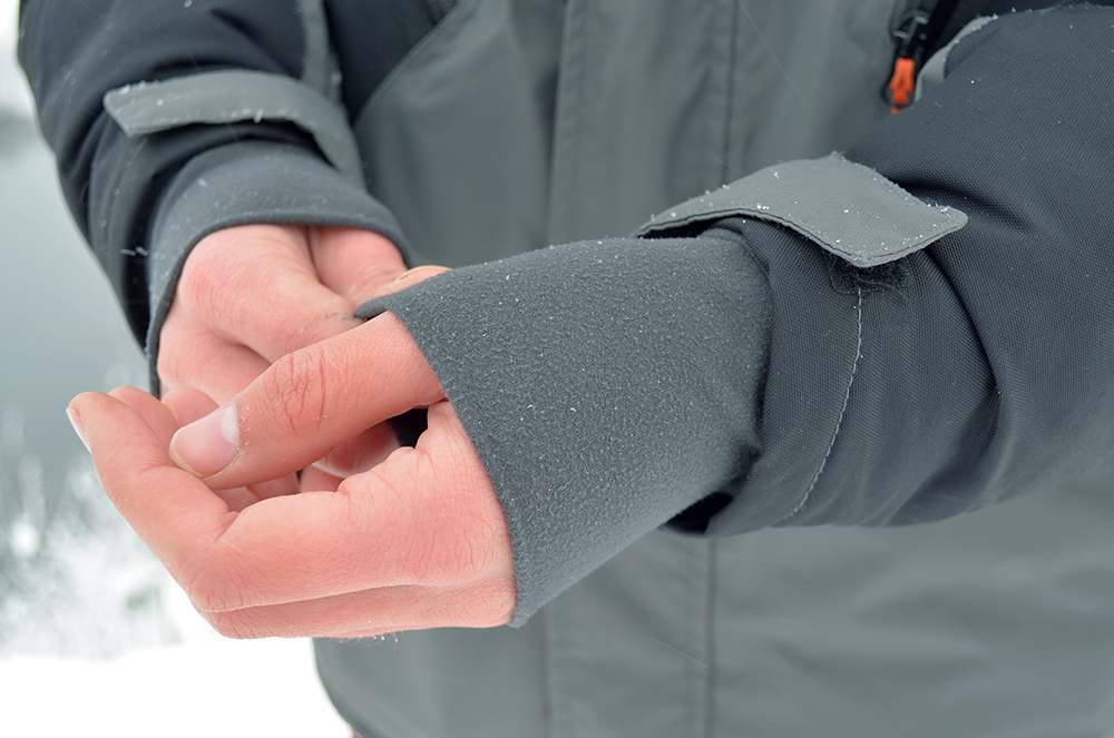 Хотя тут еще сказывается и устройство манжет. С одной стороны, куртка устроена по рыболовному стандарту – с соответствующей утягивающей липучкой, которой можно отрегулировать манжету. С другой – есть еще и внутренняя манжета из тонкого флиса. Она дополнительно фиксирует рукав на руке, закрывает возможные пути попадания ветра и влаги вовнутрь и согревает кисти при надобности. Плюс удобная длина, что дает все перечисленные функции и еще возможность убрать флисовую манжету в рукав. Флис здесь используется довольно тонкий, поэтому не стоит увлекаться постоянным упаковыванием кисти, а надеть перчатки. Ведь такая толщина не позволяет долго держать форму и со временем (при интенсивных натягиваниях) манжетка станет расхлябанной и покроется характерными катышками.