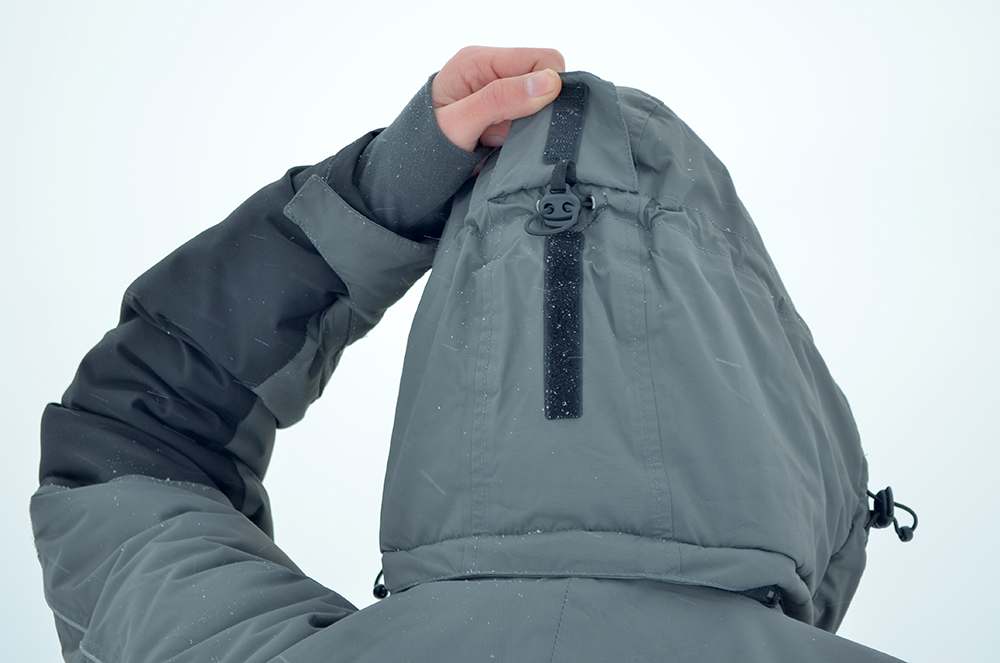 Двойная система регулировки есть и у капюшона. Стандартные стяжки по краям и дополнительная сзади. Однако, что приятно, – затылочная стяжка не болтается в разные стороны, а скрыта под специальной нашлепкой. Таким образом, продираясь через густые кусты, ветки будут иметь минимум шансов стянуть капюшон и насыпать в него снега. Еще одна приятная конструктивная особенность – фиксирующиеся «уши», которые на липучках крепятся на воротнике в специальных пазах. Плюс небольшой полумягкий козырек и тонкий флис внутри.