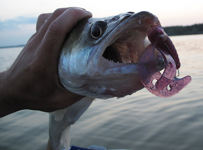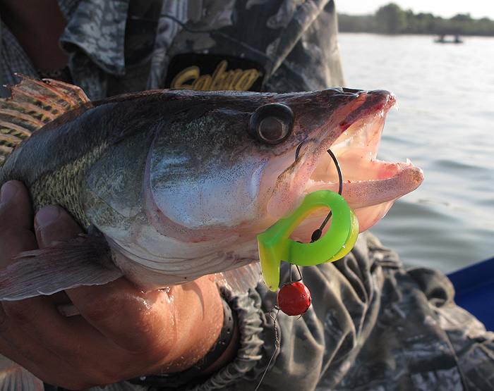 Я не зря уделил много внимания вопросу дополнительного фиксирования приманки на крючке. С необходимостью решения проблемы сползания виброхвостов (с твистерами в этом плане проблем обычно возникает меньше) столкнулся именно тогда, когда начал ловить судака целенаправленно. Довольно часто он стягивал приманку, не засекаясь. А если не рыба, то корчи нередко сбивали приманку, делая бессмысленной дальнейшую проводку.