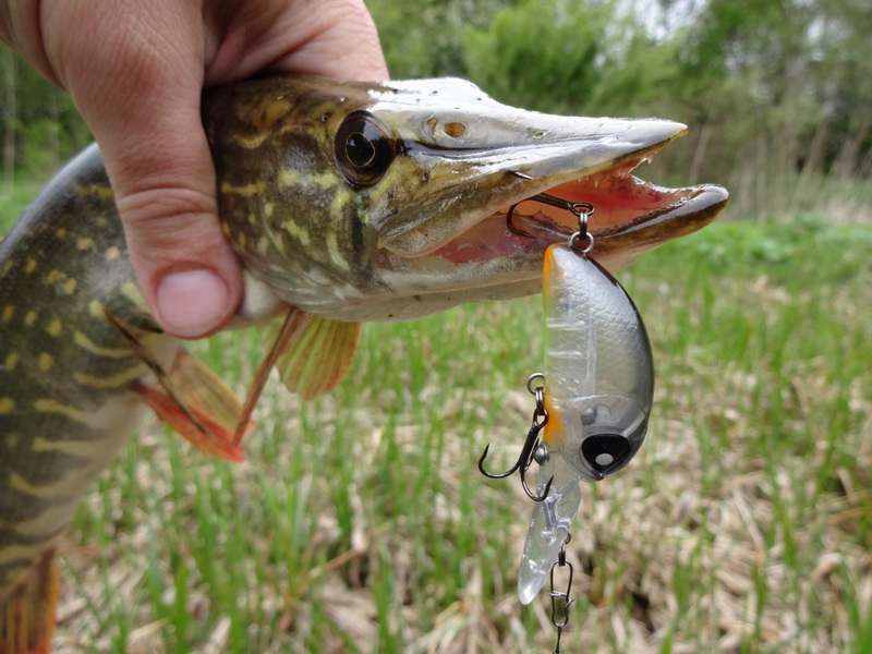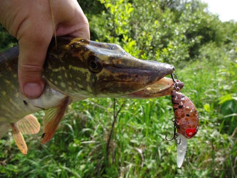 Имея заглубление чуть больше метра, воблером TINY 33 F Plus One можно сделать проводку максимально близко к краю ямы, или чуть ниже, провоцируя хищника на атаку. В такие моменты очень часто и попадается вездесущая щука, стоящая на входе в яму, под бровкой в ожидании добычи.