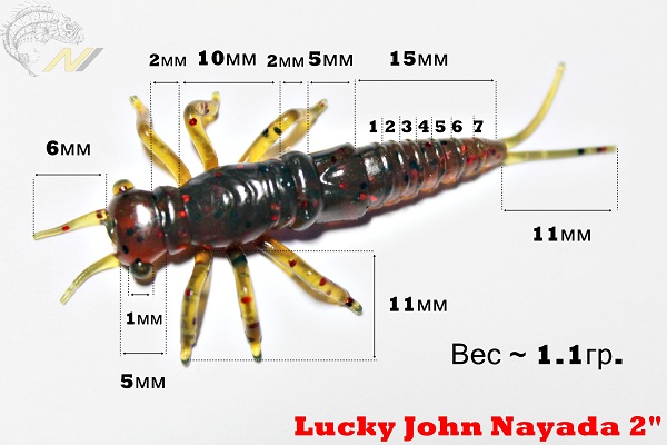 У ведущего бренда силиконовых приманок Lucky John уже давно были выпущены имитация опарыша и мотыля, и в этом году они выпускаются имитацию личинки стрекозы под названием Nayada.