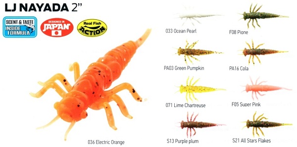 LJ Nayada – это мягкая съедобная силиконовая приманка с запахом макрели, которая очень точно копирует личинку живой стрекозы. Ни для кого не секрет, что различные имитации подводных насекомых и ракообразных - это абсолютно рабочие приманки в любое время года и по самым разным видам рыб, включая и мирных, будь то карп, карась, сазан, лещ, толстолобик, плотва, красноперка и др. Но, в первую очередь, эта приманка конечно была направлена на пресноводных хищников, таких как щука, судак, окунь, голавль, жерех и язь. Поэтому Nayada выпускается в размере 2 дюйма (5,1 см) и представлена в 9-ти востребованных расцветках, которые будут актуальны для ловли самых разных видов рыб.