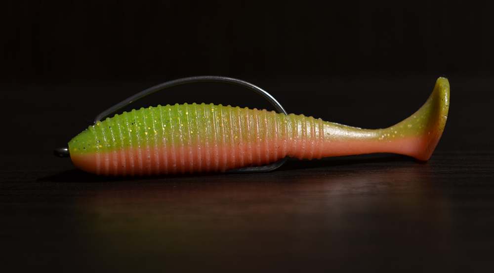 Однако полезно будет использовать эту форму еще и в тех ситуациях, когда рыба недостаточно широко открывает рот. С окунем такая история сплошь и рядом. Со щукой и судаком пореже, но тоже имеет место. Поэтому часть виброхвостов Bugsy Shad 3.9 в болотно-джиговой коробочке я оснастил именно моделью LJH340, чтобы в случае надобности все-таки реализовать ту единственную поклевку.
