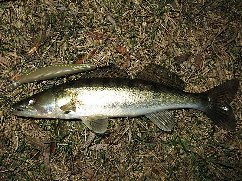 А произошла она довольно быстро – судачок граммов на 700 догоняет воблер у самого парапета и резво цепляется на крючок. Вел бы приманку быстрее – мог и не догнать. Итак, разловил все-таки новинку! Уже не зря упирался. Далее следует еще одна бойкая поклевка в том же месте, но мимо.