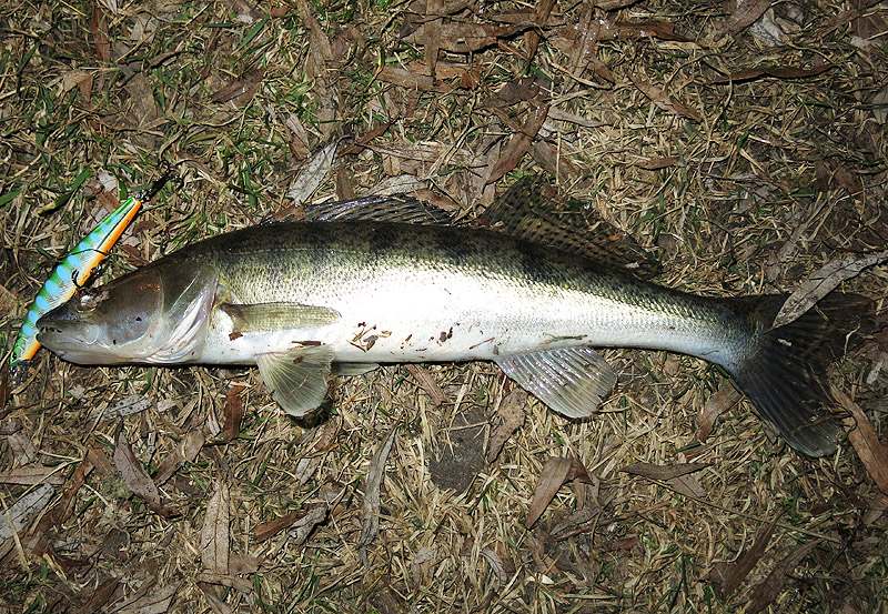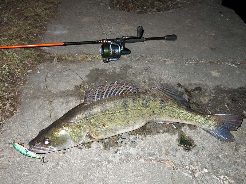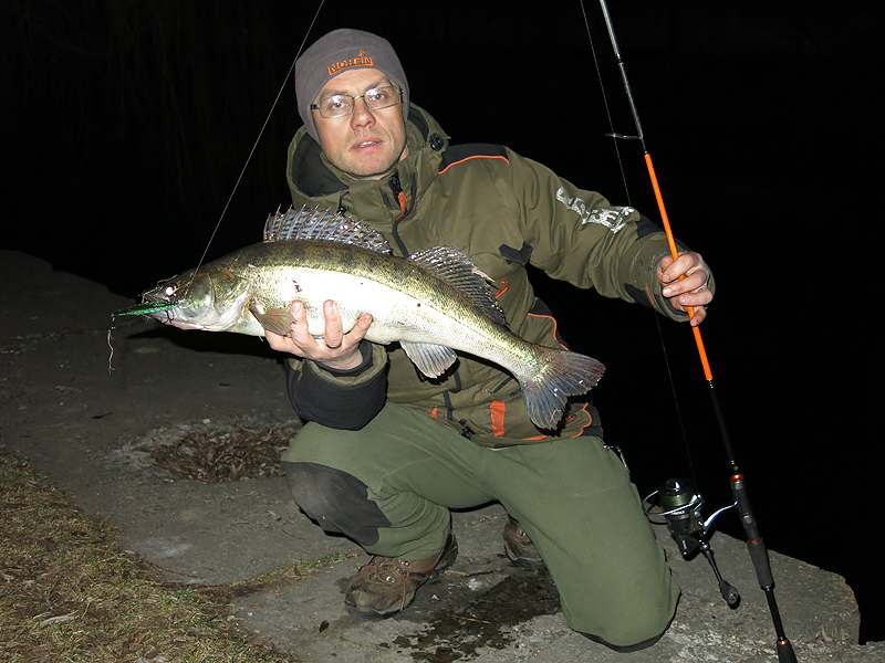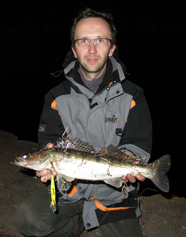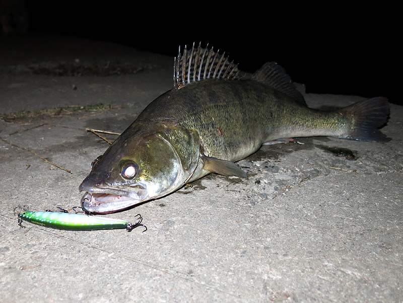 К 23 часам набережная опустела, но я решаю сделать еще с десяток забросов, поставив проверенный 104-й цвет. В очередной раз послав воблер к противоположному берегу, но немного ниже по течению, стал делать потяжки, и чувствую, как приманка залазит в «зеленку» – нитевидные водоросли, покрывающие какой-то выступ на дне. Резким движением достаю ее, быстро выбираю слабину шнура и получаю настоящий судаковый удар! После резкой подсечки удачно водворяю клыкастого на парапет, подняв на плетенке. Этот ночной судак оказался на 100 грамм меньше пойманного днем ранее – 2350.