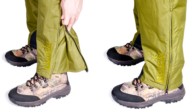 Для регулировки объема, манжеты брюк оснащены застежками-молниями.